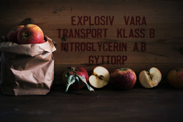 Me encanta la composición que hace con las manzanas, la bolsa de papel y la caja de madera.