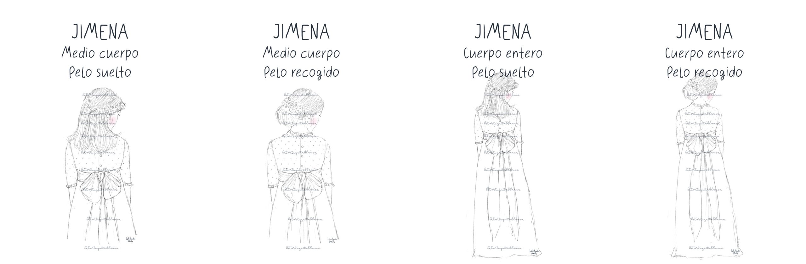 La esencia de la colección JIMENA la forma una ilustración de trazos sencillos, en lapicero con un toque de color, con cuatro variantes: Cuerpo entero con pelo recogido y Cuerpo entero con pelo suelto y Medio cuerpo con pelo recogido y Medio cuerpo con pelo suelto. Además de poder elegir entre estos 4 modelos, te ofrezco varias posibilidades de personalización: color, modificar vestido, cambiar el peinado… Todo para adaptar el diseño a tu pequeña.