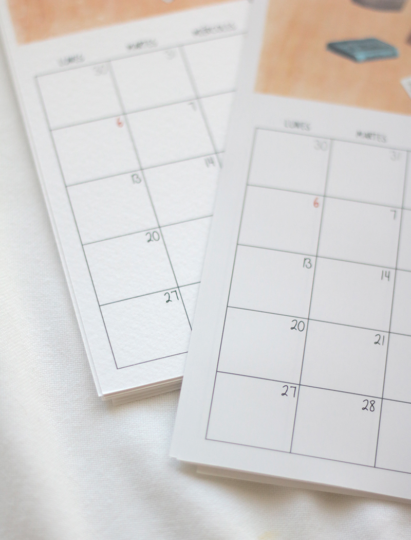 En el formato normal la portada y contraportada son de papel profesional de 260 grs y las hojas interiores de papel profesional más fino, de textura lisa. De esta forma el calendario pesa menos y es más manejable.