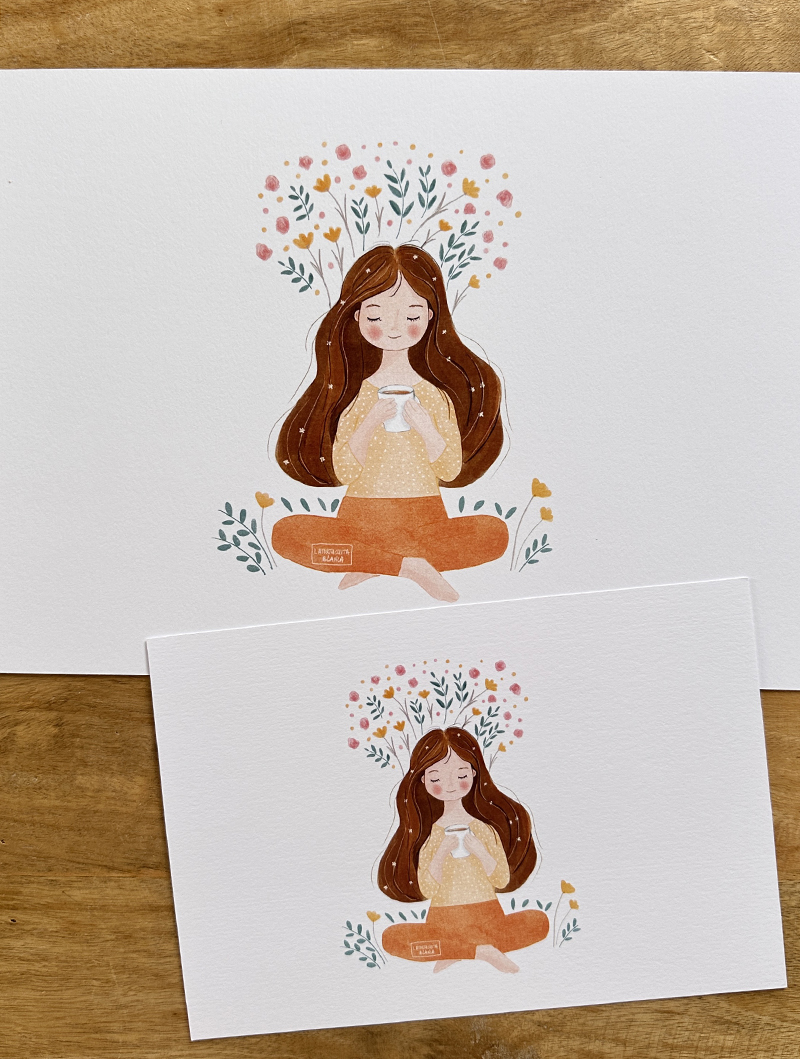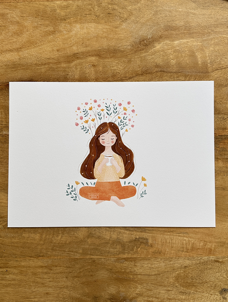 La lámina MI PEQUEÑO RITUAL es una ilustración que evoca un momento de calma, autocuidado y bienestar. Un momento de relax con pensamientos bonitos y disfrutando del momento.