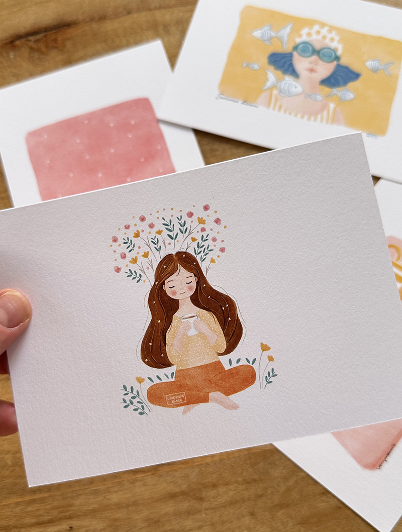 La lámina que te vas a llevar a casa es una reproducción de la ilustración original, impresa en papel COTTON italiano con textura de papel de acuarela, acabado mate, libre de ácidos y un gramaje de 270gramos. El proceso de impresión se realiza de forma artesanal en mi estudio, cuidando al máximo todos los detalles para que el resultado final sea óptimo.