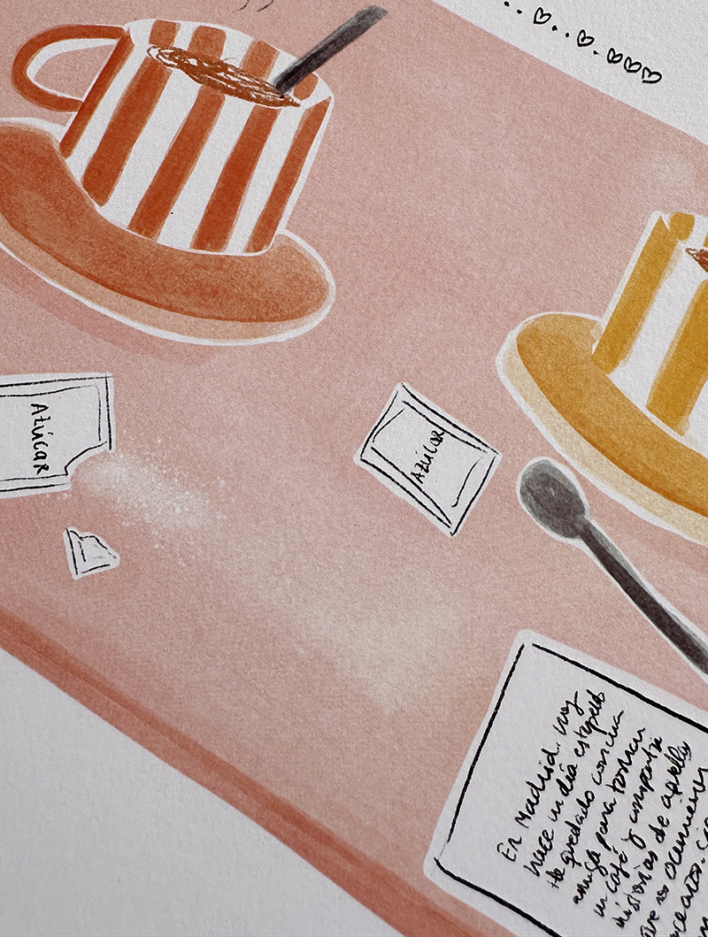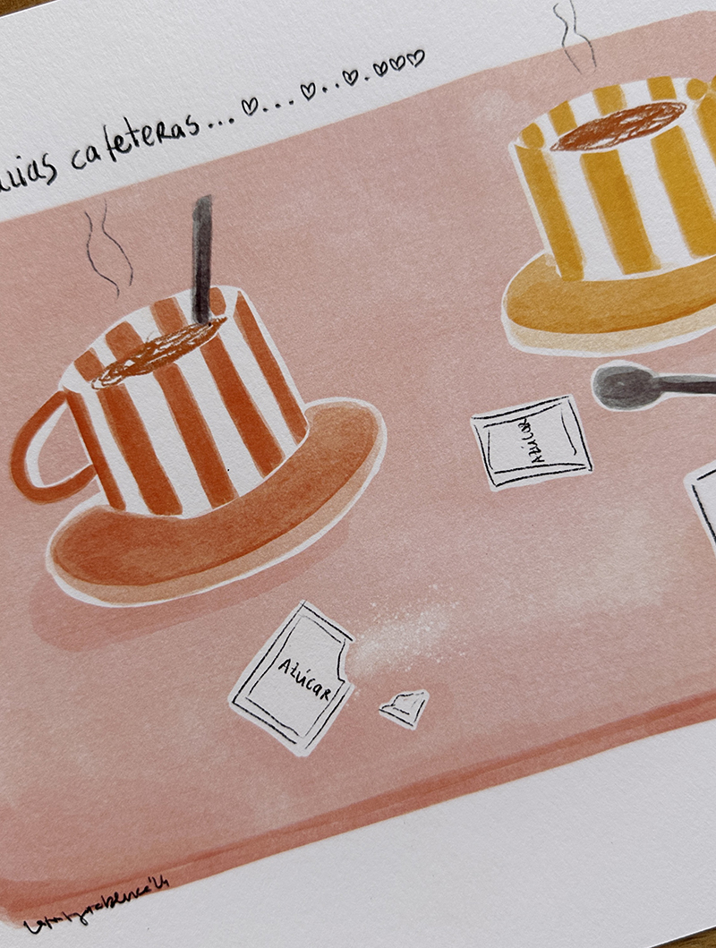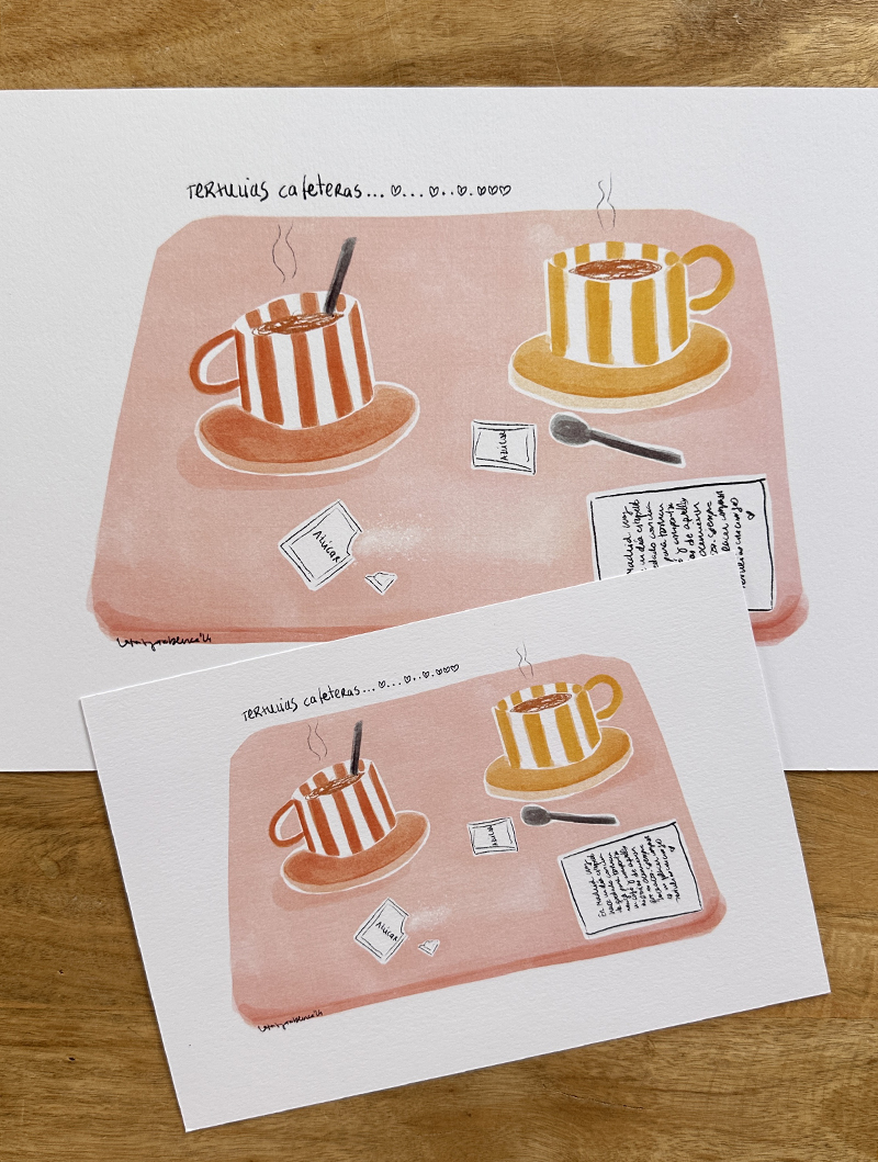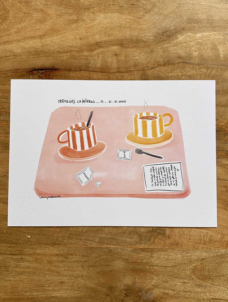 La lámina TERTULIAS CAFETERAS es una ilustración que captura ese instante de charla, de compartir anécdotas, preocupaciones, penas y alegrías alrededor de unas tazas de café.