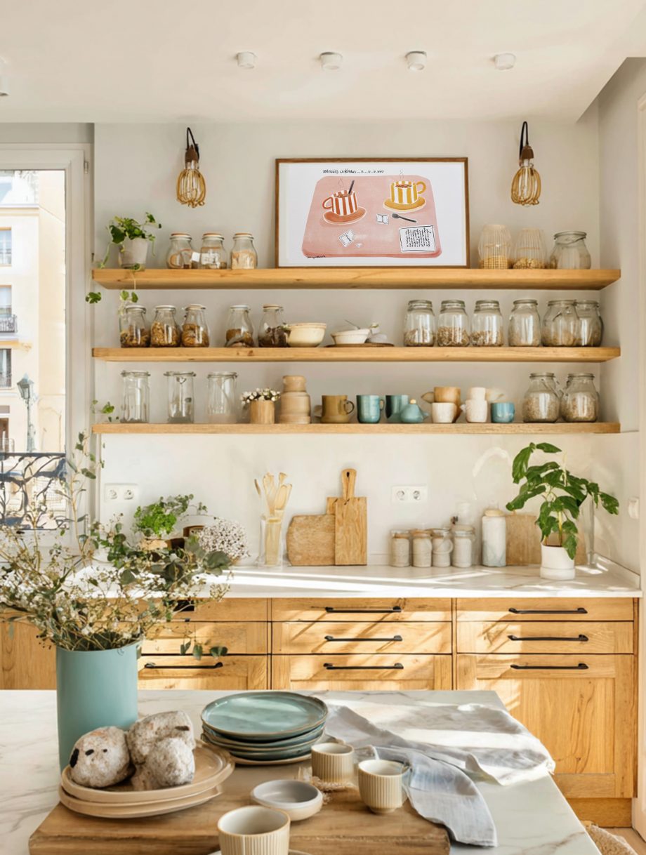Es una lámina decorativa de colores vivos y alegres ideal para decorar el comedor, la cocina, o cualquier otro espacio de casa. Es un regalo precioso para esa persona con la que compartes estos momentos.