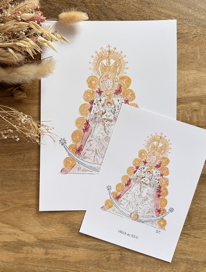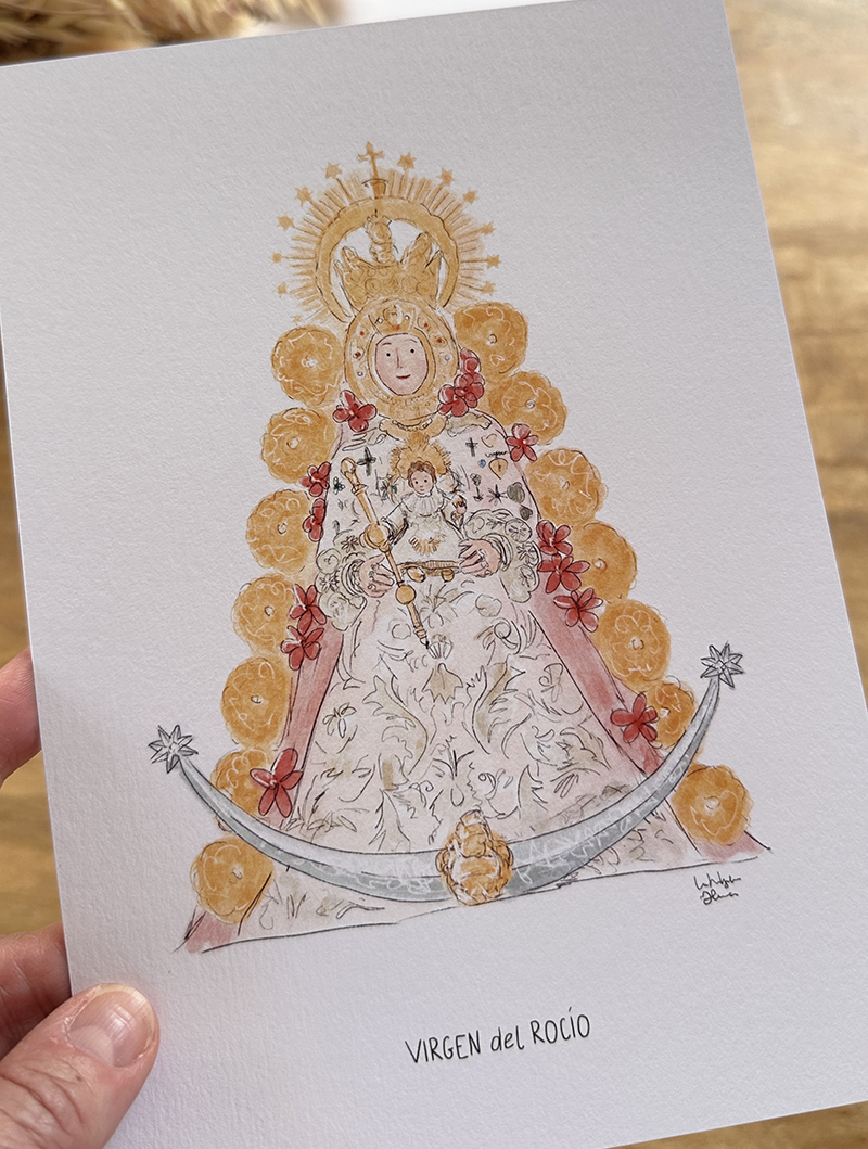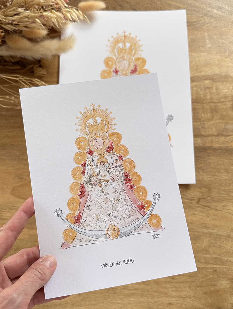 Lámina con la ilustración de la VIRGEN del ROCÍO. Una ilustración preciosa ideal ideal para decorar el dormitorio, para tener a mano en la mesilla o hacer un bonito regalo. También es perfecta para preparar unas invitaciones o recordatorios de bautizo o comunión.