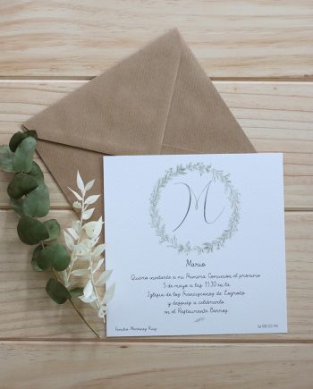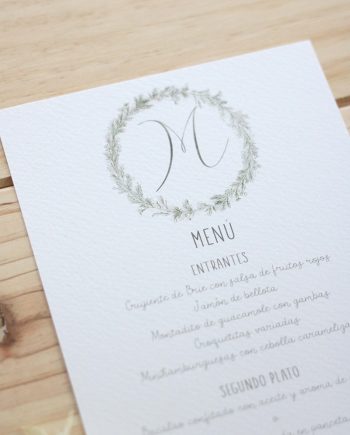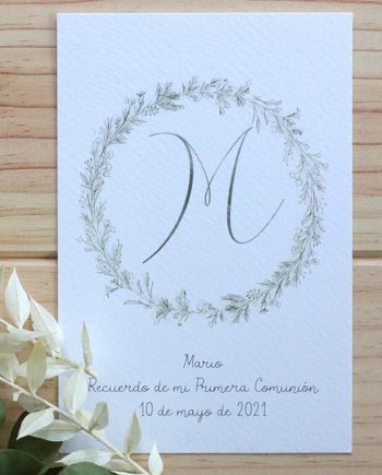 La portada exterior se personaliza con una lámina A5 con el diseño de la inicial y la corona vegetal. Dos colores disponibles, verde oliva y rosa empolvado. Si prefieres otro color, puedes indicarlo en el pedido.