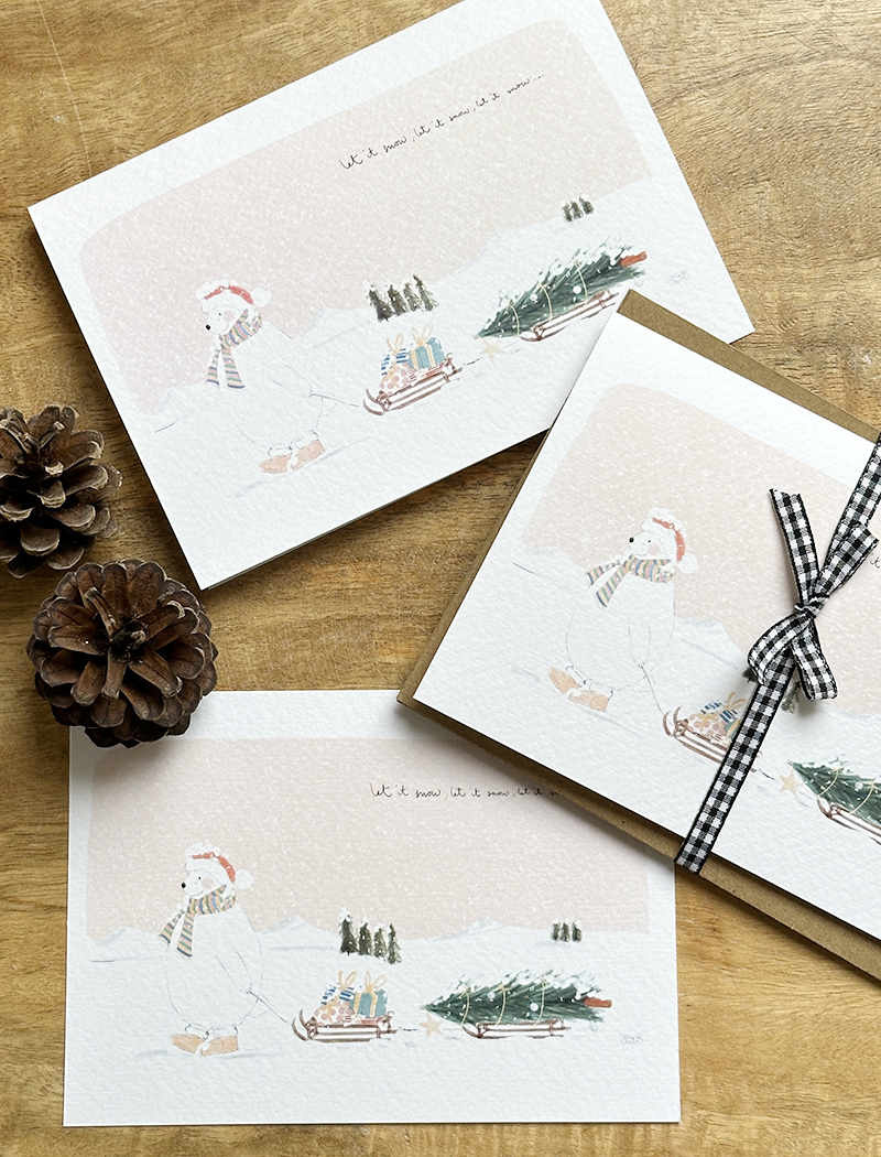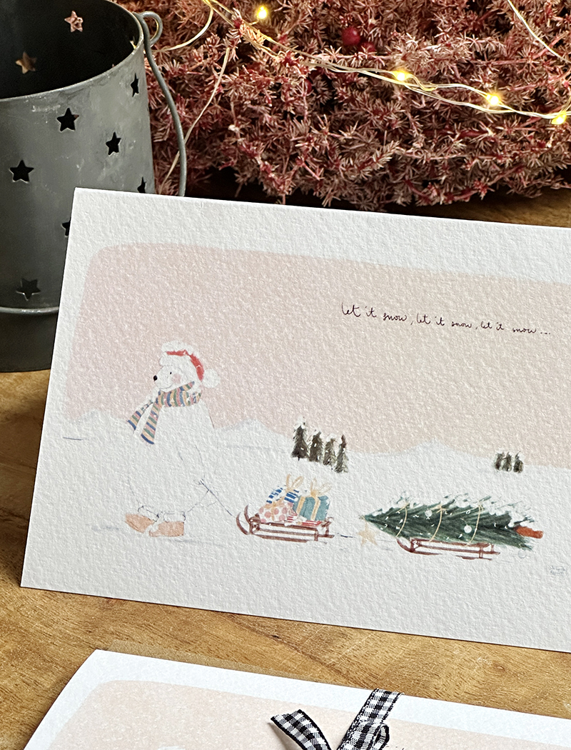 Un pack de  2 felicitaciones navideñas  con la ilustración de un adorable oso polar tirando de un trineo lleno de regalos.