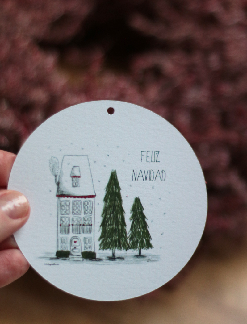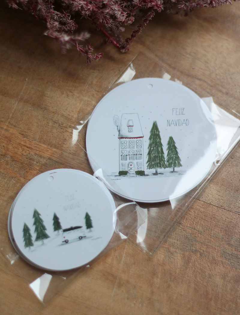 Packs de ETIQUETAS REDONDAS para tus regalos Navideños. Con el diseño de las casitas nevadas. Son ideales para dar un toque especial a tus regalos de esta Navidad.