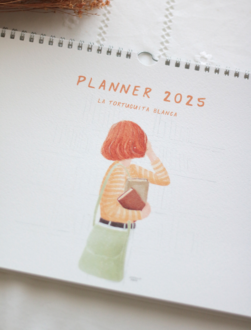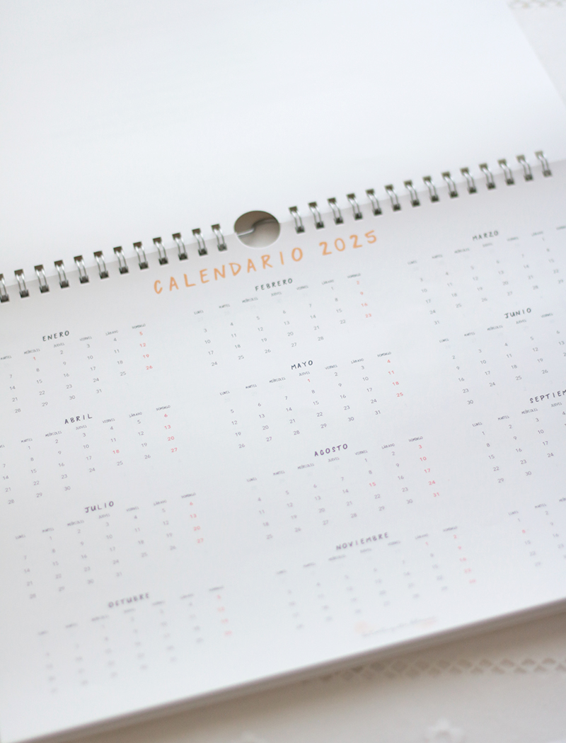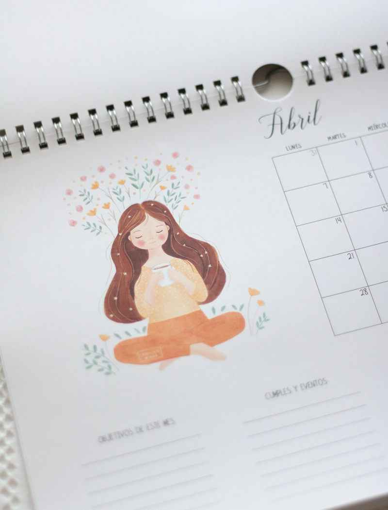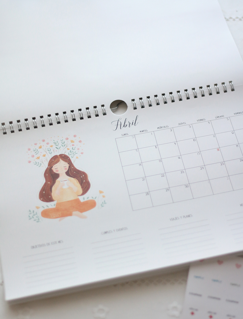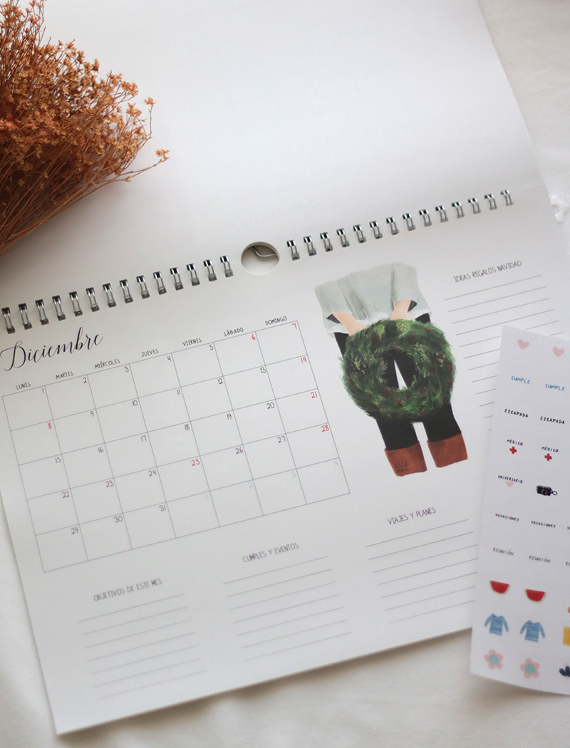 El planificador consta de 15 hojas: portada, 1 hoja con el calendario anual, 12 hojas impresas a una cara con todos los meses, contraportada y una hoja A5 con pegatinas redondas removibles con ilustraciones y textos variados.