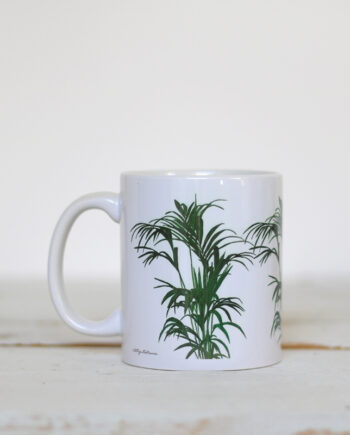 Taza con la ilustración de unas coronas de eucalipto y bayas, unas tijeras y una bobina, con la frase «enjoy the moment«. Ideal para hacer un bonito regalo o para disfrutarla en tus desayunos y cafés.