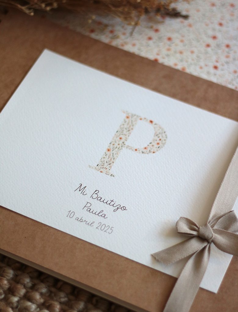 Un libro de BAUTIZO para apuntar todos lo detalles de un día tan importante, reunir las firmas de los invitados y poner algunas fotos más especiales. Con espacios en blanco para rellenar a mano. De tapas duras de acabado kraft, espiral y 15 hojas de tacto de algodón está elaborado a mano en una pequeña imprenta local. La portada exterior se personaliza con una lámina A5 con el diseño de la inicial y la corona vegetal. Dos colores disponibles, verde oliva y rosa empolvado. Si prefieres otro color, puedes indicarlo en el pedido. Contenido: 1 hoja portada; 4 hojas para rellenar con detalles del día; 2 hojas para firmas y dedicatorias; 2 hojas para recuerdos y recordatorios 3 hojas para fotos 3 hojas vacías para lo que se quiera.