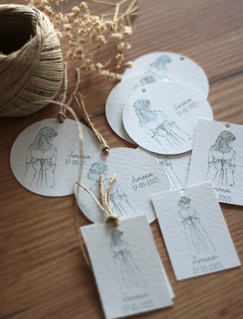 Etiquetas con el diseño de colección JIMENA Son ideales para personalizar los detalles de los invitados. Se puede escribir el nombre del niño/a que hace la comunión, nombre y fecha, una frase, nombre y una frase. Un máximo de 3 lineas teniendo en cuenta la anchura de la etiqueta. Hay varios formatos disponibles*: REDONDAS de varios diámetros (4cms, 5cms y 6cms) RECTANGULARES de 4x6cms Vienen en packs de 24, 36 y 48 uds*. Las etiquetas llevan su agujerito, y están impresas en papel tintoretto de 270 grs. No se incluye la cuerda. Se presentan en bolsita de celofán. * Si quieres otro formato/tamaño y otras cantidades solicita presupuesto personalizado o escríbenos a info@latortuguitablanca.com.