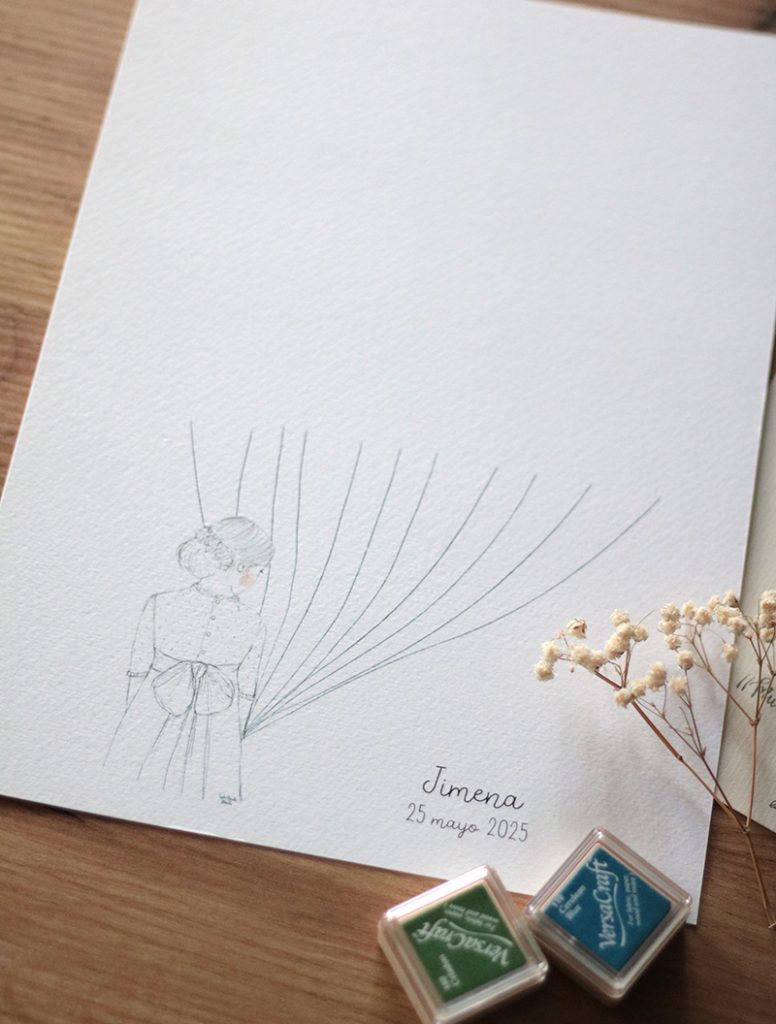 Lámina de huellas con la ilustración de la colección JIMENA. Puedes elegir cualquiera de las cuatro opciones: cuerpo entero pelo recogido o pelo suelto y medio cuerpo pelo recogido o pelo suelto. Las láminas de huellas son una idea genial como recuerdo de la primera comunión. Los invitados dejan su huella estampada en la lámina personalizada con el nombre y la fecha y con una ilustración original de La Tortuguita Blanca. En esta lámina las huellas simulan unos globos atados por unas cuerdas y que sujeta la niña de comunión. Puedes añadir a tu pedido una o varias cajitas de tinta. Dos tamaños 30x40cms y A4 (21x29,7cms). Para otros tamaños consultar en info@latortuguitablanca.com Impresa en papel modigliani con gramaje (260gr/m2) con textura similar al papel de acuarela. Incluye lámina A5 con instrucciones de uso. No incluye marco. Si necesitas marco consultar en info@latortuguitablanca.com
