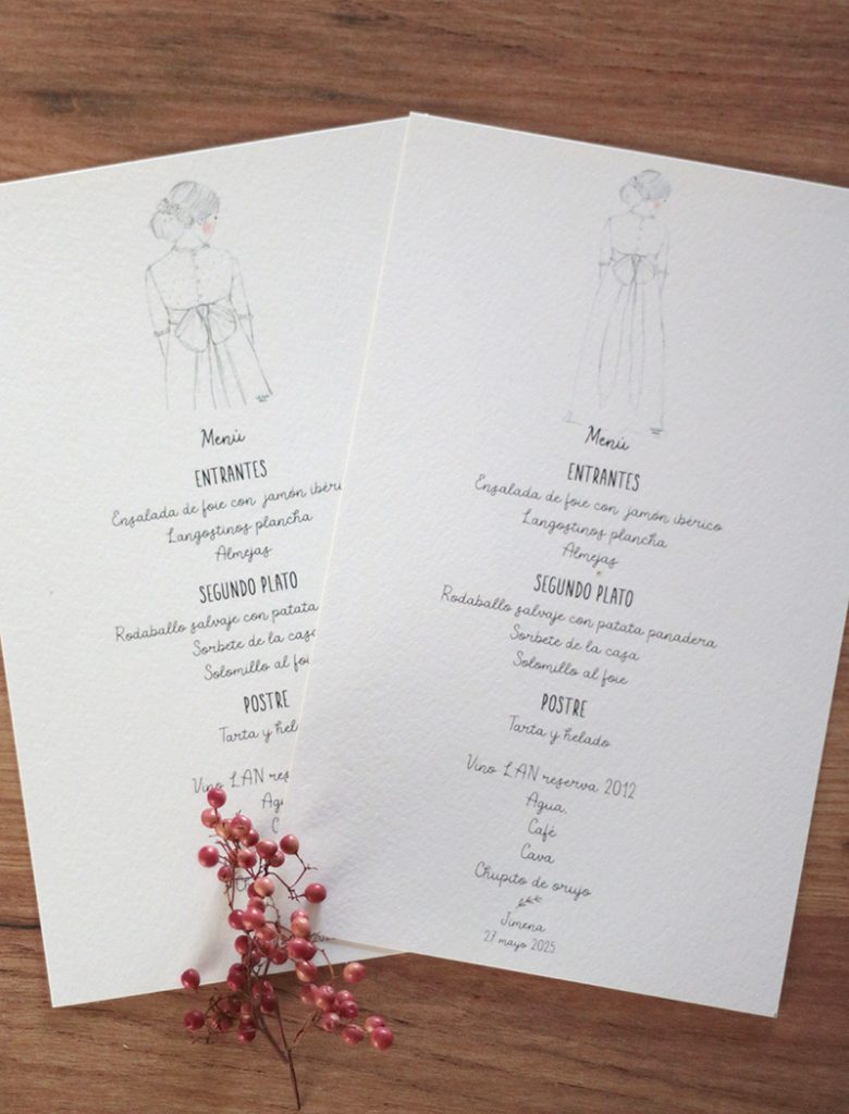 Los menús de Primera Comunión JIMENA son un complemento ideal para la celebración de un día tan especial. Con ellos logras dar un toque elegante a las mesas de invitados. Lo primero que tienes que elegir es el tipo de papel. Tienes 3 opciones, las puedes ver detalladas aquí . Ahora toca elegir el dibujo de JIMENA que te gusta más: cuerpo entero pelo recogido, cuerpo entero pelo suelto, medio cuerpo pelo recogido, medio cuerpo pelo suelto. Envíanos adjunto el menú del restaurante y en unos días te enviamos prueba personalizada. Cualquier duda puedes enviar un correo a pedidos@latortuguitablanca.com Las medidas de los menús son 13x21cms. Cantidad mínima 20 unidades. Precio unitario 3,50€