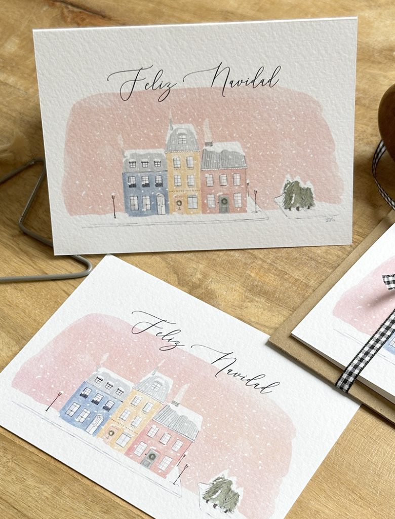Un pack de 2 felicitaciones navideñas con la ilustración de unas casitas nevadas. Dos formatos: postal sencilla y postal plegada en tamaño A6. La impresión la he realizado en el estudio utilizando un papel italiano de gramaje superior. La felicitación navideña incluye un sobre kraft. Si tienes una pequeña empresa y quieres personalizar con tu logo pídenos presupuesto en info@latortuguitablanca.com Diseño original de La Tortuguita Blanca.