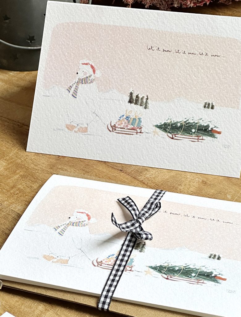 Un pack de 2 felicitaciones navideñas con la ilustración de un adorable oso polar tirando de un trineo lleno de regalos. Dos formatos: postal sencilla y postal plegada en tamaño A6. La impresión la he realizado en el estudio utilizando un papel italiano de gramaje superior. La felicitación navideña incluye un sobre kraft. Si tienes una pequeña empresa y quieres personalizar con tu logo pídenos presupuesto en info@latortuguitablanca.com Diseño original de La Tortuguita Blanca.