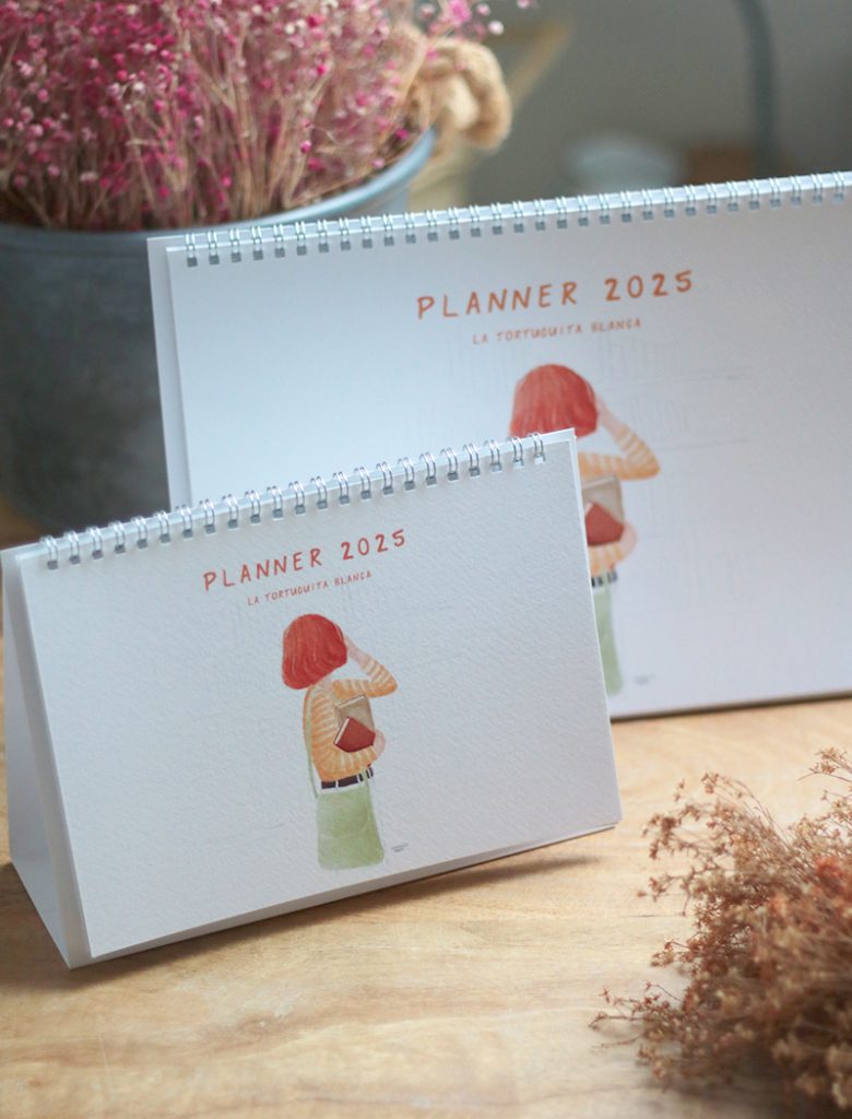 El planner mensual de mesa 2025 es perfecto para apuntar tus objetivos, planes y otros asuntos y visualizarlo cada mes. Esta pensado para que lo utilices en tu escritorio apoyado sobre la mesa y al tener su espiral te permite doblarlo y que te ocupe la mitad. Cada mes ocupa una hoja, impresa por un único lado y está ilustrado con ilustraciones variadas y de estilos diferentes. En cada mes vas a tener, además de la cuadrícula con los días, espacio para apuntar: - Objetivos mensuales; - Cumples y eventos; - Viajes y planes; - Notas. También puedes utilizar la parte trasera del mes anterior para pegar fotografías, recortes, dibujar o tomar notas de temas importantes. Incluye una hoja de pegatinas removibles que puedes pegar y despegar y recolocar de nuevo. Está disponible en dos tamaños A4 y A5. La portada está impresa en papel profesional de 260 grs de gramaje y las interiores en papel profesional de 150grs. El planificador consta de 15 hojas: portada, 1 hoja con el calendario anual, 12 hojas impresas a una cara con todos los meses, contraportada y una hoja A5 con pegatinas redondas removibles con ilustraciones y textos variados. Sobre una base plegable de cartulina de 400grs. para que pueda sostenerse sobre la mesa. Es ideal para tenerlo a mano cada día en tu oficina o estudio.