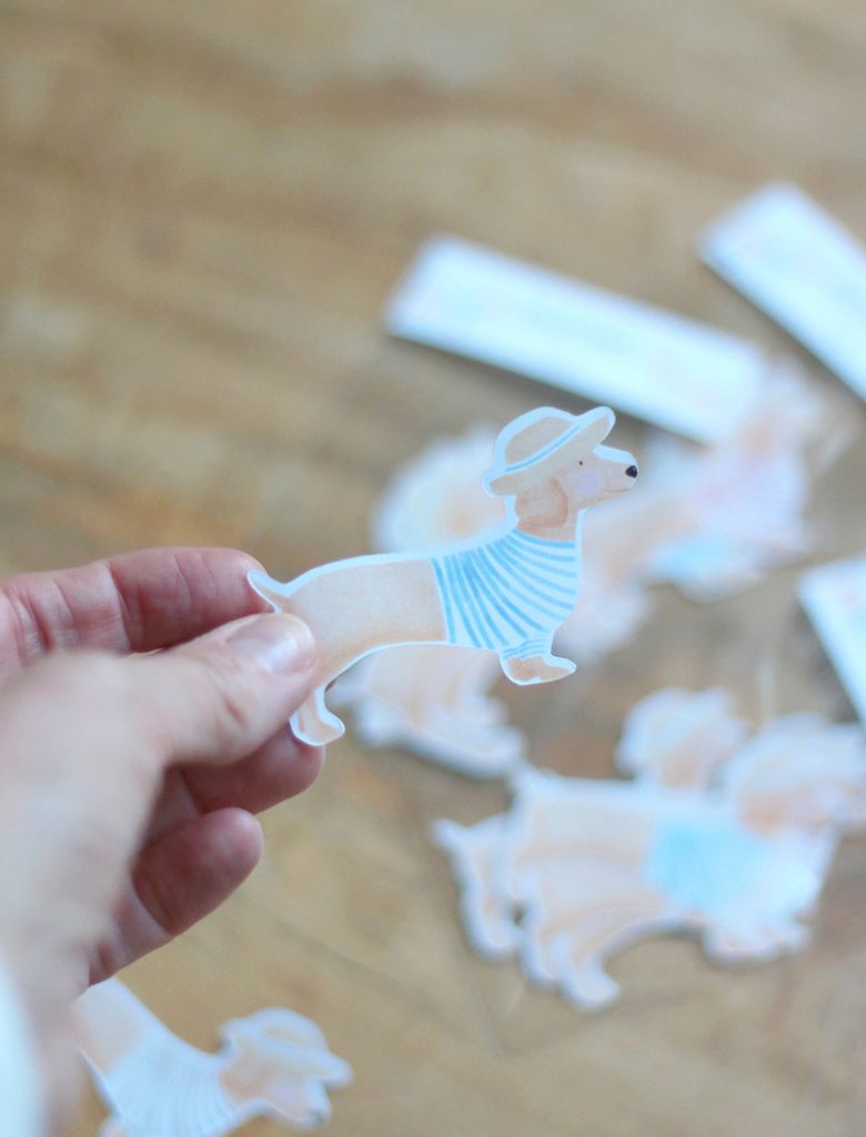 Un pack de 5 PEGATINAS con la ilustración del PERRO SALCHICHA con camiseta de rayas de distintos colores. Son removibles, reposicionables y reusables y no dejan ningún rastro de pegamento. Son ideales para colocarlas en cualquier superficie: pared, en libros, hojas de papel, ordenador, nevera... Cada pegatina tiene un tamaño aproximado de 7cms de ancho y 4,5 cms de alto. Se presentan en una bolsita de celofán. Es una ilustración original de La Tortuguita Blanca.