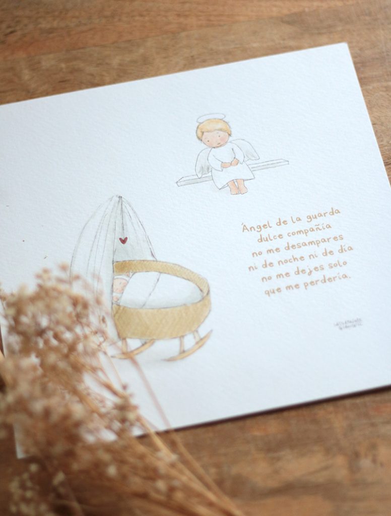 Esta lámina es una nueva versión de la lámina ORACIÓN Ángel de la Guarda. En esta ocasión, he ilustrado a un bebé durmiendo plácidamente en su cunita bajo la atenta mirada de un angelito, en versión niño y niña. Es una lámina llena de ternura, ideal para decorar la habitación del bebé y por supuesto, para regalar como detalle de bienvenida al bebé o de bautizo. Puedes personalizarla con una con un nombre, una fecha o incluso una pequeña frase. La lámina que te vas a llevar a casa es una reproducción de la ilustración original, impresa en papel TINTORETTO (con textura de papel de acuarela), acabado mate, libre de ácidos y un gramaje de 300gramos. El proceso de impresión se realiza de forma artesanal en una imprenta local, cuidando al máximo todos los detalles para que el resultado final sea óptimo. Disponible en varios tamaños. Los tamaños L y XL se imprimen en papel photo satin 240 grs. No incluye marco pero puedes solicitarla enmarcada para los tamaños A5, A4 y 20x20. Se presenta en bolsa de celofán y los tamaños A3, L y XL en tubo de cartón.
