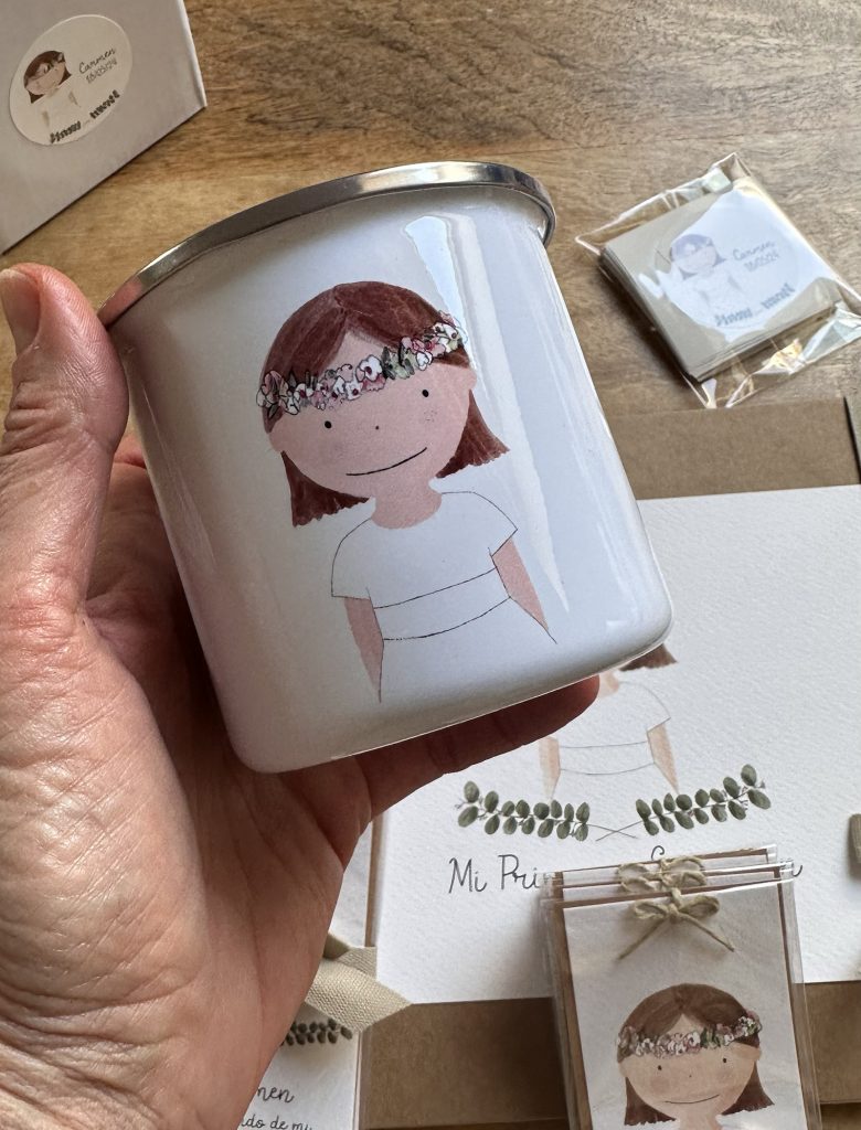 Taza con el diseño de colección OLIVIA. Disponible en cerámica y metal. Personaliza el dibujo a tu gusto: puedes elegir el color del pelo, el peinado, corona, cruz y el color del lazo. Indica si quieres añadir una frase, nombre y fecha o ambas opciones. Son perfectas como detalle de comunión, tanto como regalo como detalle para los invitados. Si quieres más de 5 unidades pídenos presupuesto en info@latortuguitablanca.com. Estas son las características de los dos modelos: Taza de cerámica de alta calidad con una capacidad de 330 ml. Apta para microondas y friegaplatos (evitar lavados intensivos y temperaturas superiores a 50 grados) Taza de metal esmaltada en blanco de 300ml. Apta para friegaplatos, evitar lavados intensivos y temperaturas superiores a 50 grados. No utilizar en microondas. Te recomiendo que las laves a mano para que te duren en óptimas condiciones el máximo tiempo posible. Se presentan en caja de cartón. Diseño original de La Tortuguita Blanca