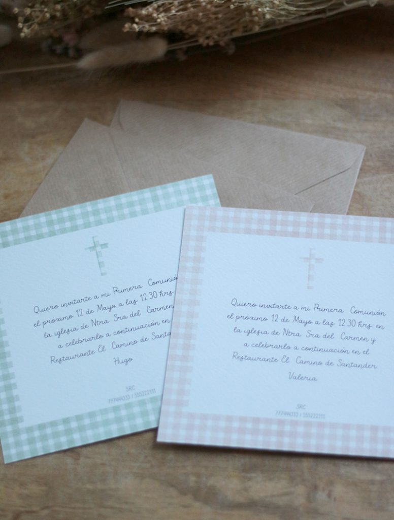 La colección de primera comunión CRUZ VICHY es un diseño clásico y sencillo ideal para las invitaciones tanto de niños como de niñas. He elegido dos colores, un verde oliva y un rosa empolvado, pero si prefieres otro te lo puedo preparar. Se trata de un trabajo muy cuidado realizado en acuarela. Son unas invitaciones de primera comunión muy especiales, que te van a encantar. Las invitaciones las tienes disponibles en tres tamaños: 10x15cms 15x15cms 15x21cms Y las puedes elegir con o sin sobre kraft. Una vez escrito el texto, para decidir la tipografía con la que diseñar tus invitaciones me pondré en contacto contigo más adelante. También se pueden diseñar con la letra escrita a mano. La colección de comunión la puedes completar con los menús, las invitaciones, una lámina de huellas y también con detalles para los invitados: espejos, chapas, tazas, libretas... Todo personalizado con el diseño que hayas elegido. También el libro de primera comunión y un sello. Cualquier duda puedes enviar un correo a pedidos@latortuguitablanca.com y te hacemos el presupuesto personalizado sin compromiso. Cantidad mínima 20 unidades.