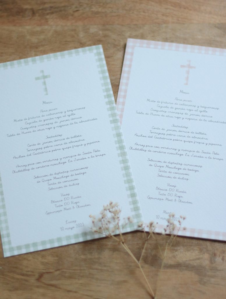 Los menús de Primera Comunión CRUZ VICHY son un complemento ideal para la celebración de un día tan especial. Con ellos logras dar un toque elegante a las mesas de invitados. Indica el color del patrón vichy. Puedes elegir entre el verde oliva y rosa empolvado. Si quieres otro color escríbenos a pedidos@latortuguitablanca.com y te indicamos las opciones y precios. Envíanos adjunto el menú del restaurante y en unos días te enviamos prueba personalizada. Cualquier duda puedes enviar un correo a pedidos@latortuguitablanca.com Las medidas de los menús son 13x21cms. Cantidad mínima 20 unidades. Precio unitario 3,50€