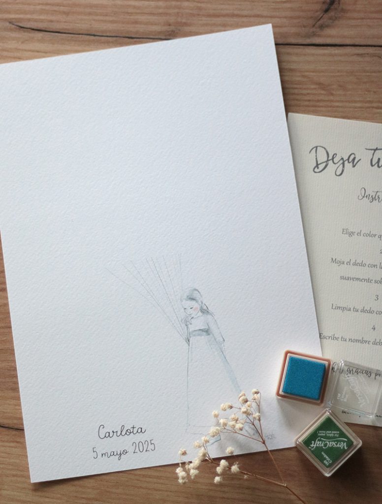 Lámina de huellas con la ilustración de la colección CARLOTA. Las láminas de huellas son una idea genial como recuerdo de la primera comunión. Los invitados dejan su huella estampada en la lámina personalizada con el nombre y la fecha y con una ilustración original de La Tortuguita Blanca. En esta lámina las huellas simulan unos globos atados por unas cuerdas y que sujeta la niña de comunión. Puedes añadir a tu pedido una o varias cajitas de tinta. Dos tamaños 30x40cms y A4 (21x29,7cms). Para otros tamaños consultar en info@latortuguitablanca.com Impresa en papel modigliani con gramaje (260gr/m2) con textura similar al papel de acuarela. Incluye lámina A5 con instrucciones de uso. No incluye marco. Si necesitas marco consultar en info@latortuguitablanca.com