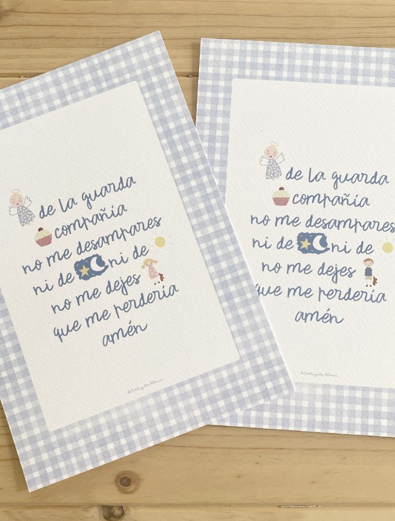La Oración Angel de la Guarda me trae tantos recuerdos...es la oración que rezaba cada noche con mi madre al acostarme. Es una lámina ideal para decorar la habitación de los más pequeños y para regalar a en un nacimiento. La puedes personalizar con un nombre y una fecha. Como novedad, te ofrecemos la opción de hacer aún más especial la lámina añadiendo un RECUADRO o PASPARTÚ pintado en VICHY AZUL. Queda ideal. Modelo NIÑO y NIÑA. Sólo se diferencia en uno de los dibujitos. Es una reproducción de la ilustración original, impresa en papel TINTORETTO (con textura de papel de acuarela), acabado mate, libre de ácidos y un gramaje de 300gramos. El proceso de impresión se realiza de forma artesanal en una imprenta local, cuidando al máximo todos los detalles para que el resultado final sea óptimo. Cada una de las impresiones van firmadas por mi. Disponible en varios tamaños. Los tamaños L y XL se imprimen en papel photo satin 240 grs. No incluye marco. Se presenta en bolsa de celofán y los tamaños A3, L y XL en tubo de cartón.