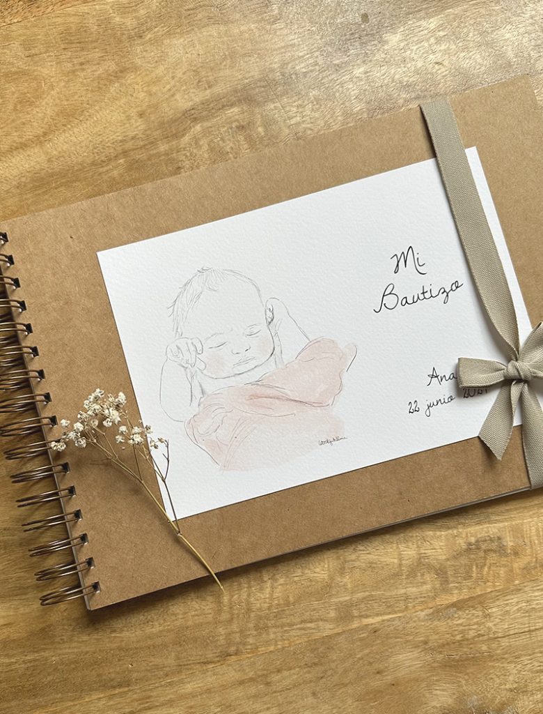Un LIBRO DE BAUTIZO es un libro diseñado para apuntar todos lo detalles de un día tan importante en la vida del bebé, reunir las firmas de los invitados, guardar recuerdos y algunas fotos más especiales. Textos con espacios en blanco para rellenar a mano. Este diseño de colección BEBÉ FLEUR está disponible en rosa, azul o sin color. Si quieres otro color o detalle escríbeme a info@latortuguitablanca.com y lo valoramos. De tapas duras de acabado kraft, espiral y 15 hojas de tacto de algodón está elaborado de forma totalmente artesanal en una pequeña imprenta local. La portada se personaliza con una lámina A5 con el diseño elegido. Rellena en el formulario los datos solicitados. Si quieres un libro personalizado con el dibujo del bebé tienes la opción del pack libro personalizado más lámina. Se presenta en caja de cartón kraft y papel de seda.
