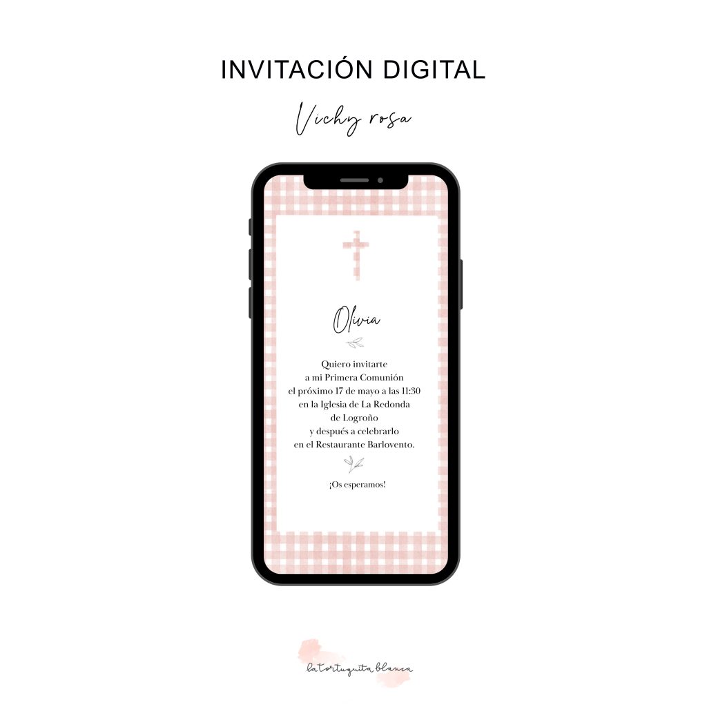 Una forma elegante y práctica de invitar a la celebración de tu peque es mediante la INVITACIÓN DIGITAL. Este es el modelo VICHY. Elige el color del patrón vichy. Tienes 4 opciones: rosa, verde, azul y negro. Personaliza tu invitación con los datos del formulario y en un plazo de 2-3 días te hacemos llegar el archivo digital para que puedas enviarla a todos los invitados, de forma fácil y rápida.