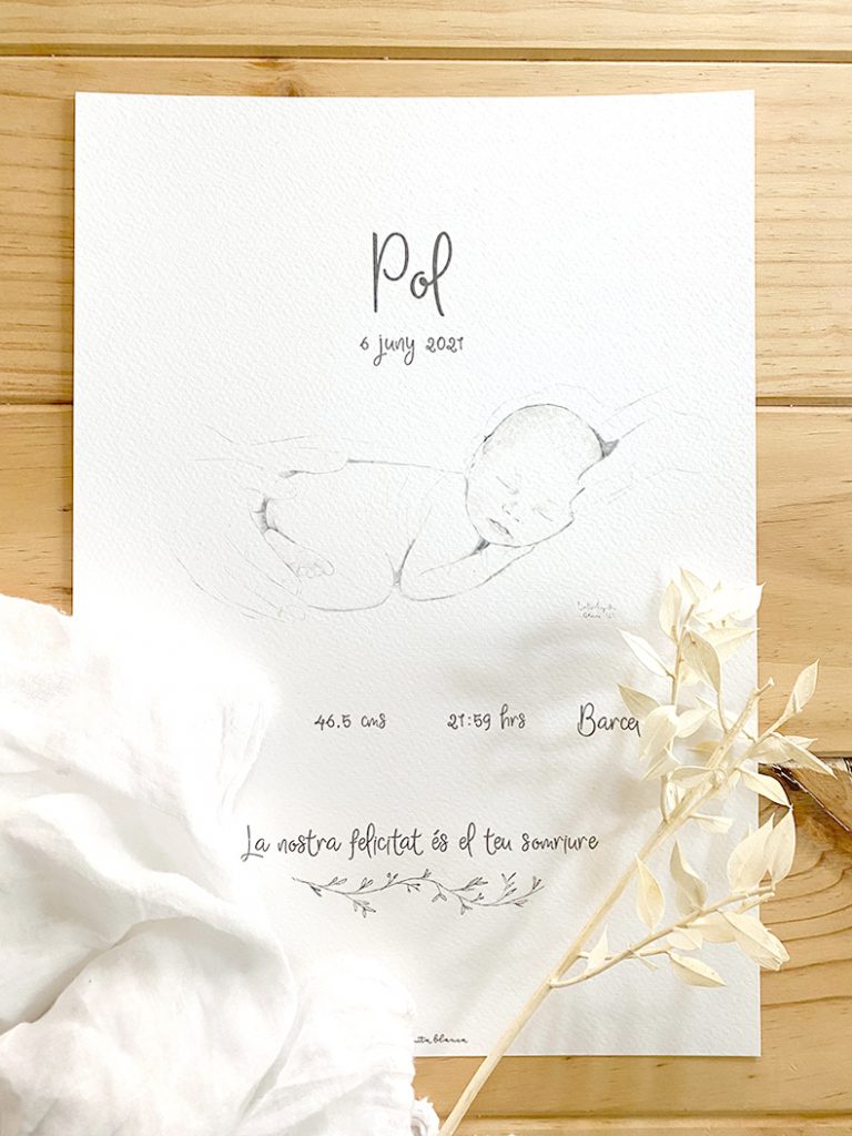 Los NATALICIOS o láminas de NACIMIENTO son un recuerdo precioso de la llegada del bebé. Con esta lámina de NATALICIO PERSONALIZADO quiero que el diseño se único y especial para los padres. Un dibujo del bebé realizado a lápiz, con trazos sencillos y elegantes, de sus primeros días de vida. Ideal para celebrar la llegada al mundo del recién nacido. Para preparar tu lámina de natalicio personalizado necesito lo siguiente: - Fotos de un primer plano del bebé con alta resolución para apreciar bien los detalles. - Nombre - Fecha - Peso - Estatura - Hora y lugar de nacimiento. Si quieres quitar, modificar o añadir algún dato más, indícalo por favor en observaciones y contactaremos contigo. La lámina la he diseñado con la frase "La estrella de nuestras vidas". Si quieres podemos quitar la frase o modificarla sin coste adicional. Si quieres la lámina enmarcada, puedes solicitarlo aquí para el tamaño A4.