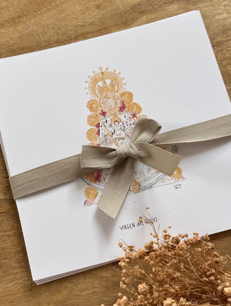 Un pack de 5 láminas cuadradas con ilustraciones de las vírgenes del Carmen, del Pilar, del Rocío, de Fatima y de La Caridad. Puedes elegir la combinación que más te guste: 5 ilustraciones distintas, todas iguales o combinar a tu gusto. Son ideales para enmarcarlas y preparar un bonito collage en un rincón de casa; también para enviar a alguien especial con un bonito mensaje o para regalarlas en pack. Impresas en papel COTTON italiano (con textura de papel de acuarela, suave), acabado mate, libre de ácidos y un gramaje de 27o gramos. El proceso de impresión se realiza de forma artesanal en mi estudio, cuidando al máximo todos los detalles para que el resultado final sea óptimo. El tamaño de las láminas es 15x15 cms. Se presentan empaquetadas con cinta de algodón en bolsita de celofán.