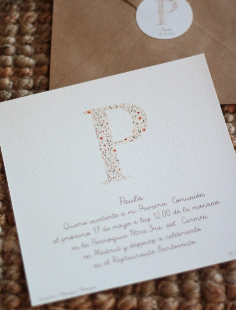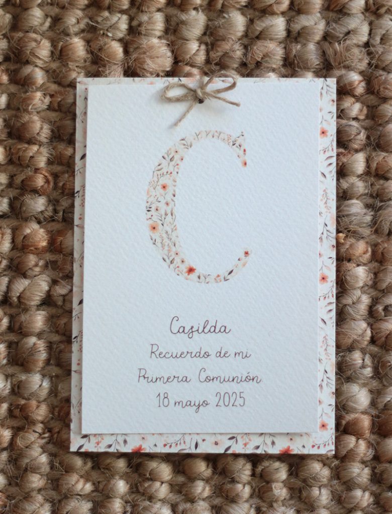 La colección de primera comunión INICIAL NATURA esta basada en unas INICIALES con una ilustración de flores en tonos tostados, tierras y ocres. Son unos recordatorios de primera comunión muy especiales, que te van a encantar. Comentarte unos aspectos que van a hacer a estos recordatorios más especiales: -El papel recomendado para estos recordatorios es el crema rugoso, aunque también tienes posibilidad de que te los preparemos en blanco rugoso o blanco liso. -El texto va en un color marrón oscuro que encaja muy bien con los tonos de la ilustración. -En caso de el elegir el formato de recordatorios o marcapáginas con cartulina y cuerdita, el tipo de cartulina que utilizaremos será la del diseño floral, que va a juego con la ilustración de la inicial Las invitaciones las tienes disponibles en tres tamaños: 10x15cms 15x15cms 15x21cms Y las puedes elegir con o sin sobre kraft. Elige el tipo de papel (si tienes dudas pincha aquí ) e indica la inicial y el color. Una vez escrito el texto, para decidir la tipografía con la que diseñar tus invitaciones me pondré en contacto contigo más adelante. También se pueden diseñar con la letra escrita a mano. La colección de comunión la puedes completar con los recordatorios, menús, etiquetas y pegatinas, libro de firmas... y también con detalles para los invitados: espejos, chapas, tazas, libretas... Todo personalizado con el diseño que hayas elegido. Puedes ver toda la colección Natura aquí Cualquier duda puedes enviar un correo a pedidos@latortuguitablanca.com y te hacemos el presupuesto personalizado sin compromiso. Cantidad mínima 20 unidades.